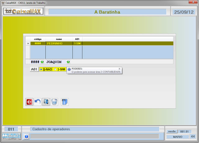 Ao iniciar um trabalho é solicitado o código do operador. Todas as operações são registradas em seu nome, facilitando a pesquisa de eventual erro ou no caso de ter que apurar uma responsabilidade.