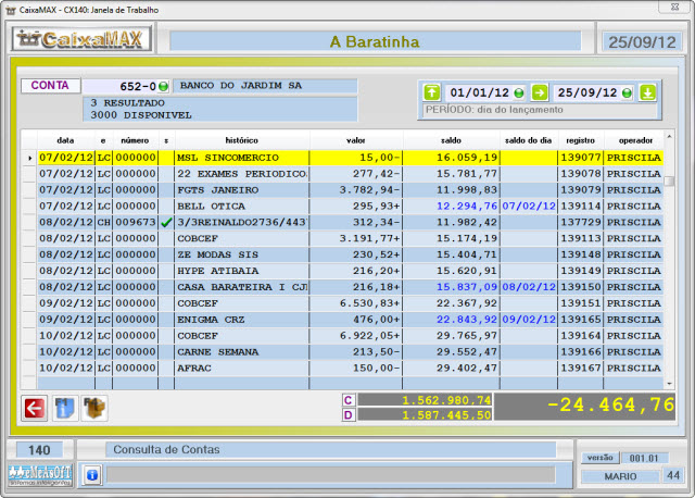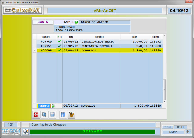 O movimento de cada conta poderá ser conferido tanto na tela como por relatório. Os cheques conciliados aparecem ticados. Emite relatório por período com resultado de todas as contas, mostrando soma por grupamento e total. Confrontando a movimentação dos grupamentos Receitas e Despesas ainda mostrará se houve superávit ou déficit no período analisado