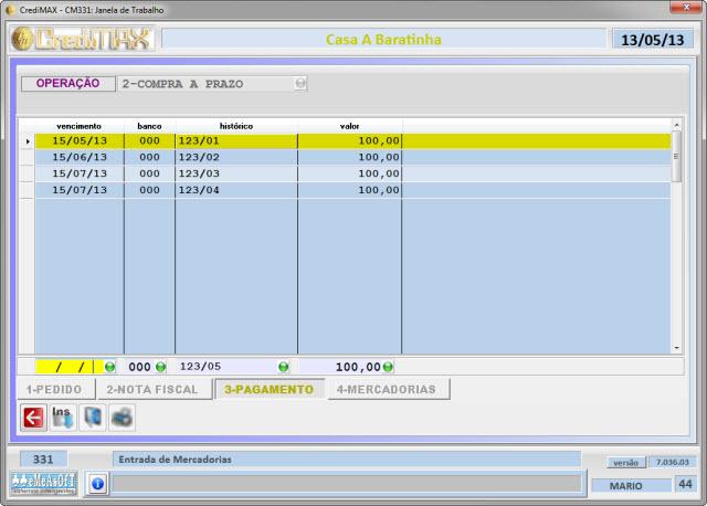 crediário à receber, cartão de crédito à receber, cheques custodiados, estoque, compras